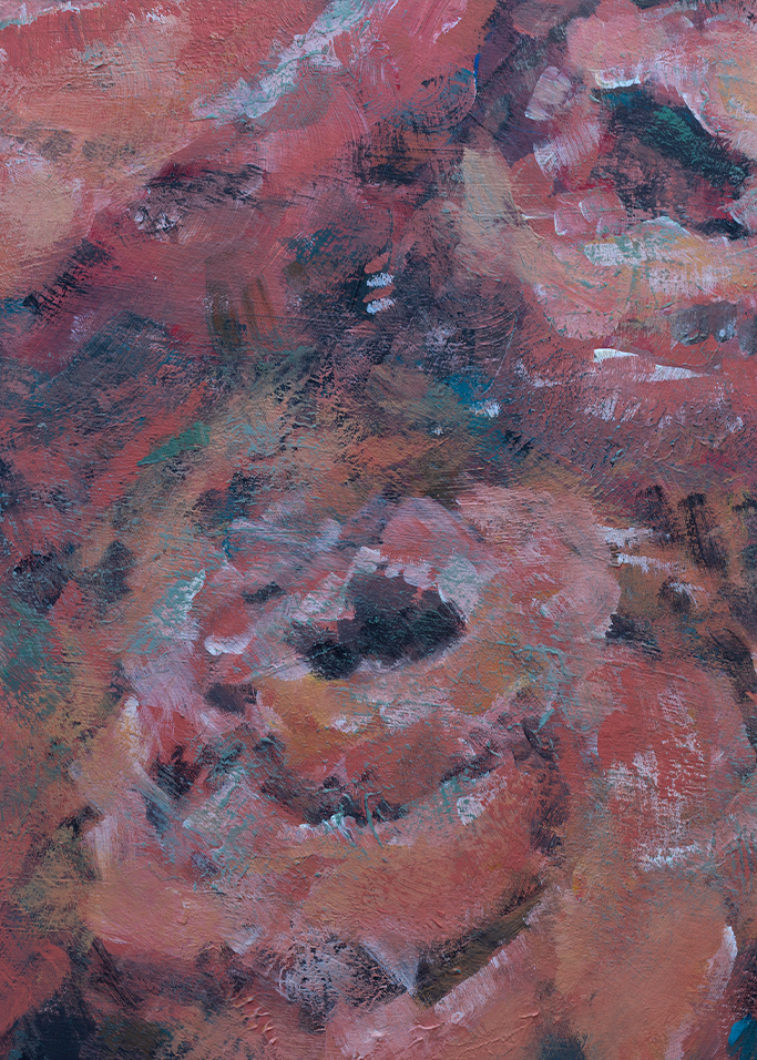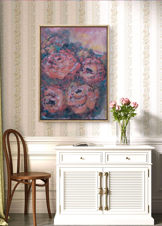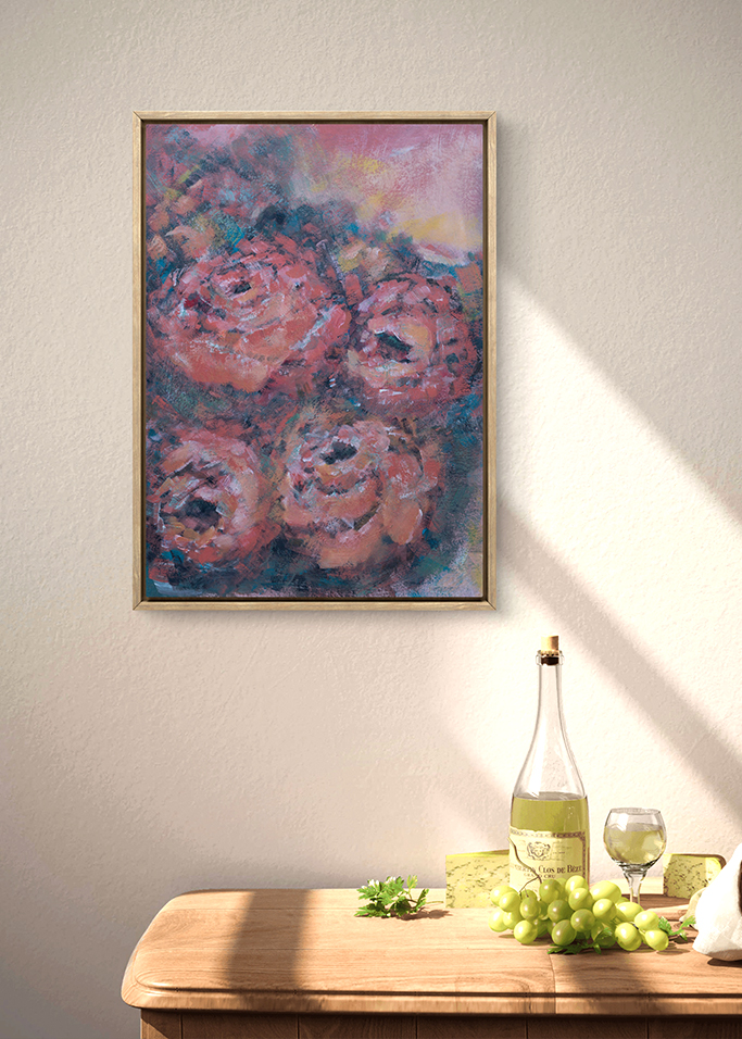 Głęboka czerwień, ciężka jak wino i nasycona jak emocja tuż przed wybuchem. Ten obraz pulsuje wewnętrznym żarem — kwiaty tworzą zwartą, niemal organiczną masę, z której wyłaniają się kolejne formy, wirujące jak płatki i cienie.
