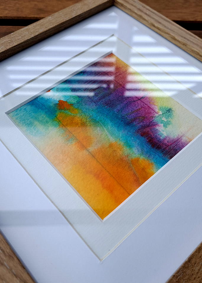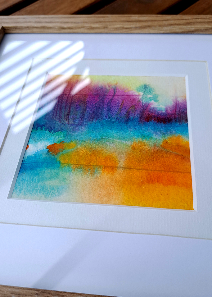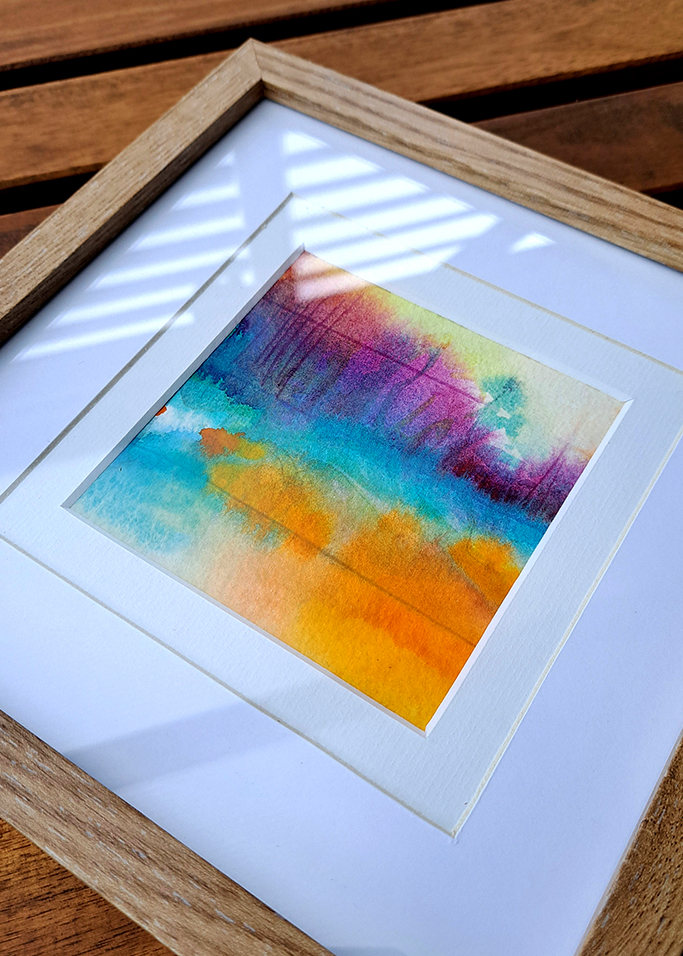 „Plener 03” | 20 cm x 20 cm | 2025 r. | akwarela, podwójne passpartue oraz ramka.