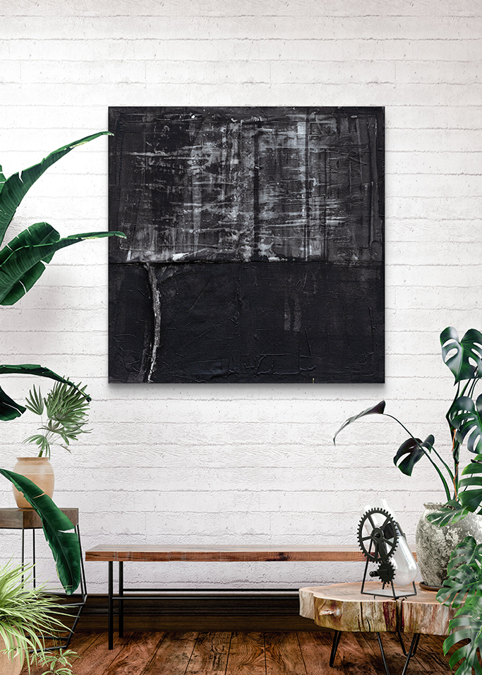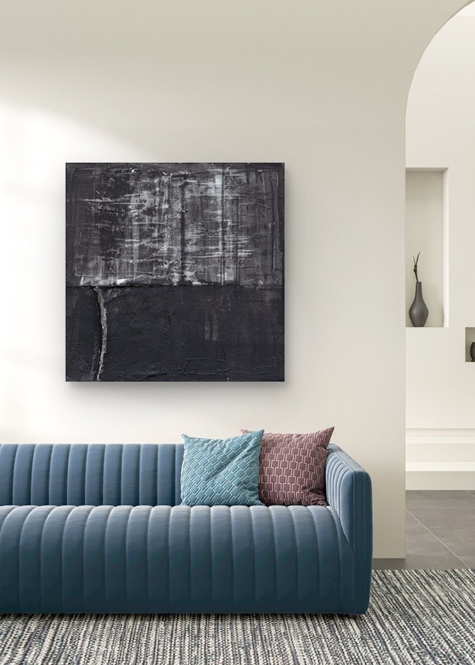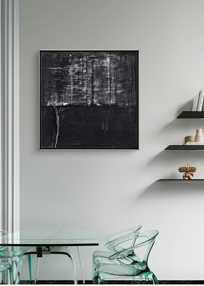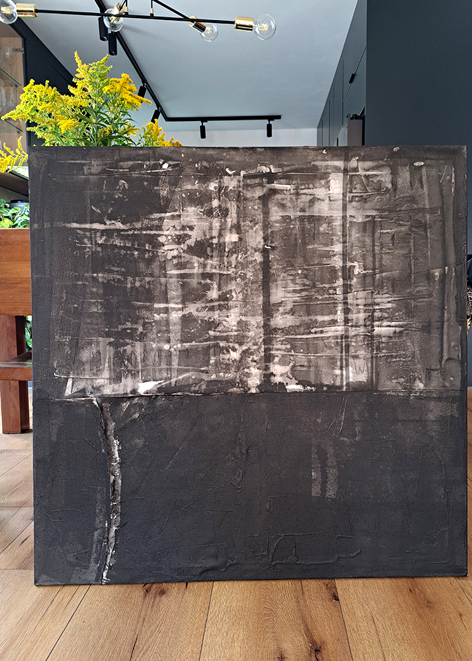 Ciemność i światło, faktura i cisza spotykają się na cienkiej linii podziału. Obraz o napięciu, które nie mówi wprost, ale zostaje w spojrzeniu na dłużej.