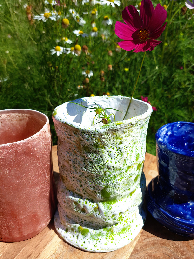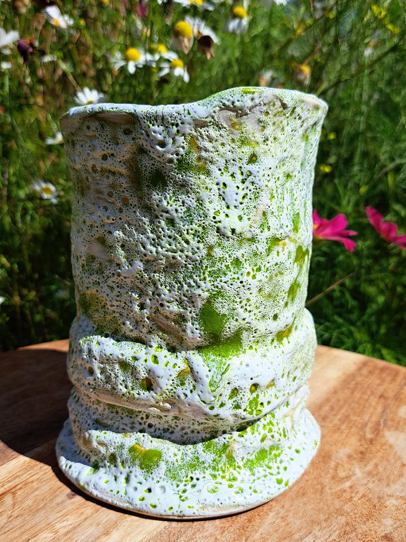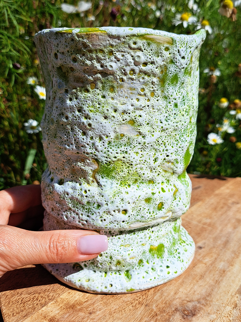 Ręcznie wykonany wazon ceramiczny o niepowtarzalnej fakturze i szkliwie w odcieniach bieli i zieleni. Organiczna forma i porowata powierzchnia sprawiają, że wygląda jak fragment natury zamknięty w ceramice. Idealny do świeżych kwiatów lub jako wyjątkowy akcent dekoracyjny do domu. 🌸