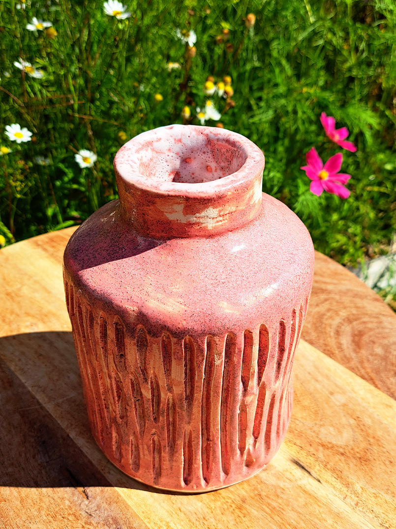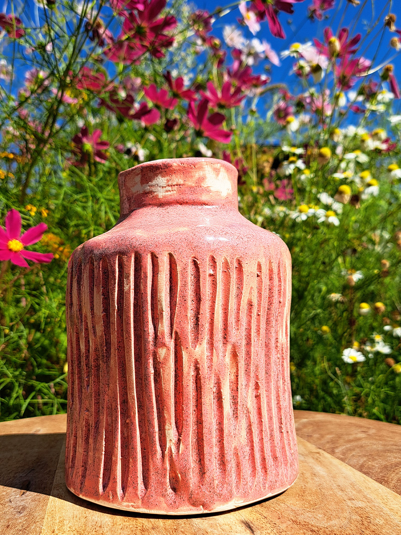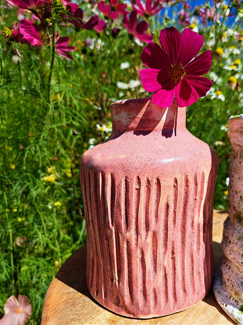 Letnia ceramika w pełnym słońcu 🌞 Ręcznie wykonany wazon o pudrowo-różowym odcieniu i wyrazistej fakturze. To mała opowieść o harmonii koloru, światła i natury 🌸