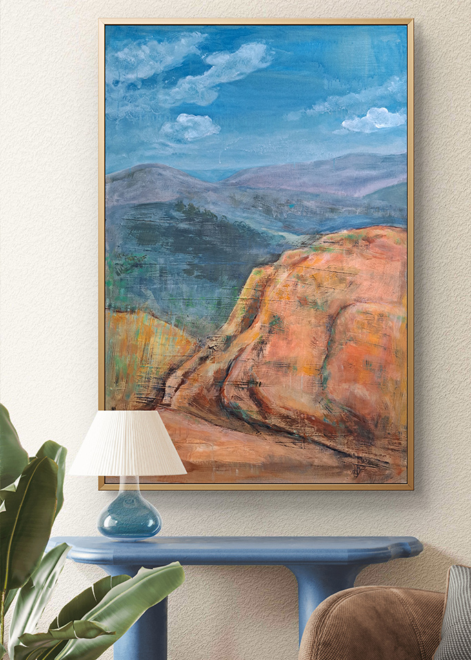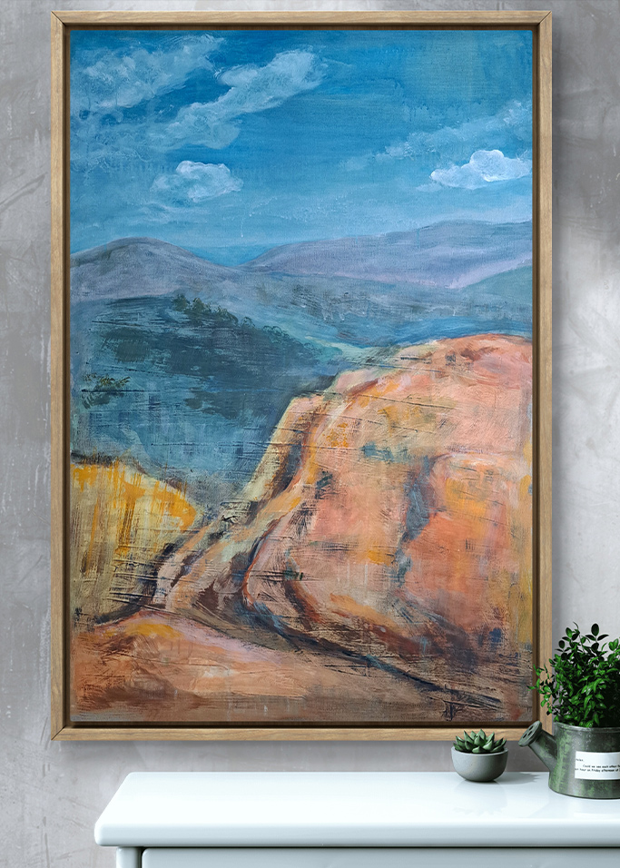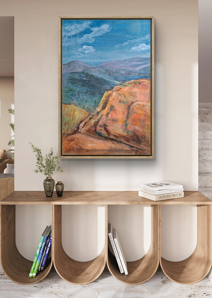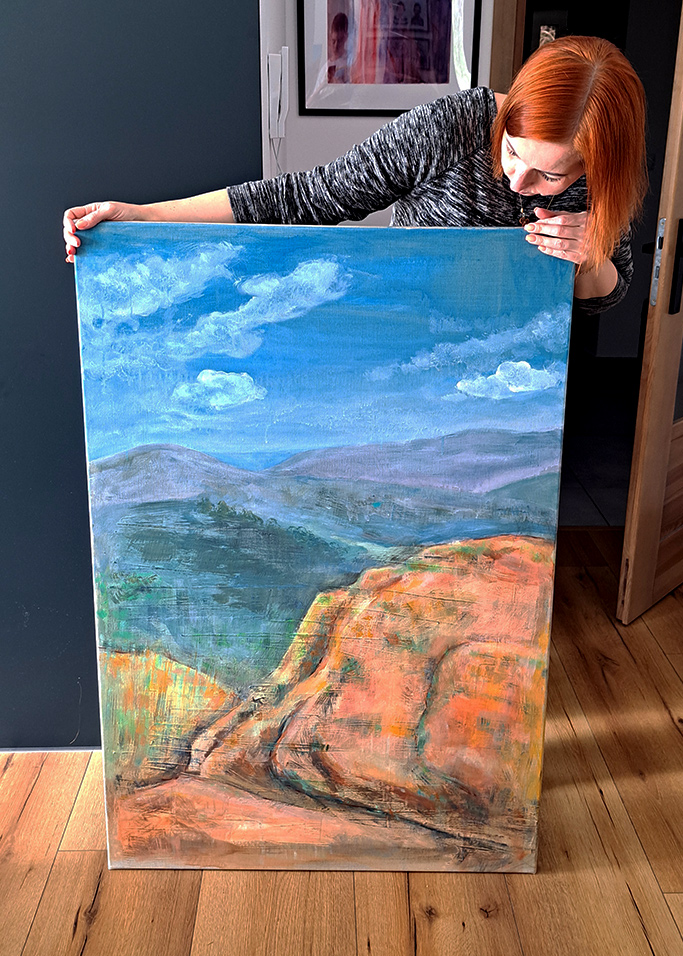 Obraz inspirowany jednym z moich ulubionych bieszczadzkich szlaków. Ciepłe kolory ziemi spotykają się tu z chłodem oddalonych grzbietów. To zatrzymany moment wędrówki – między tu i teraz a tym, co za horyzontem.