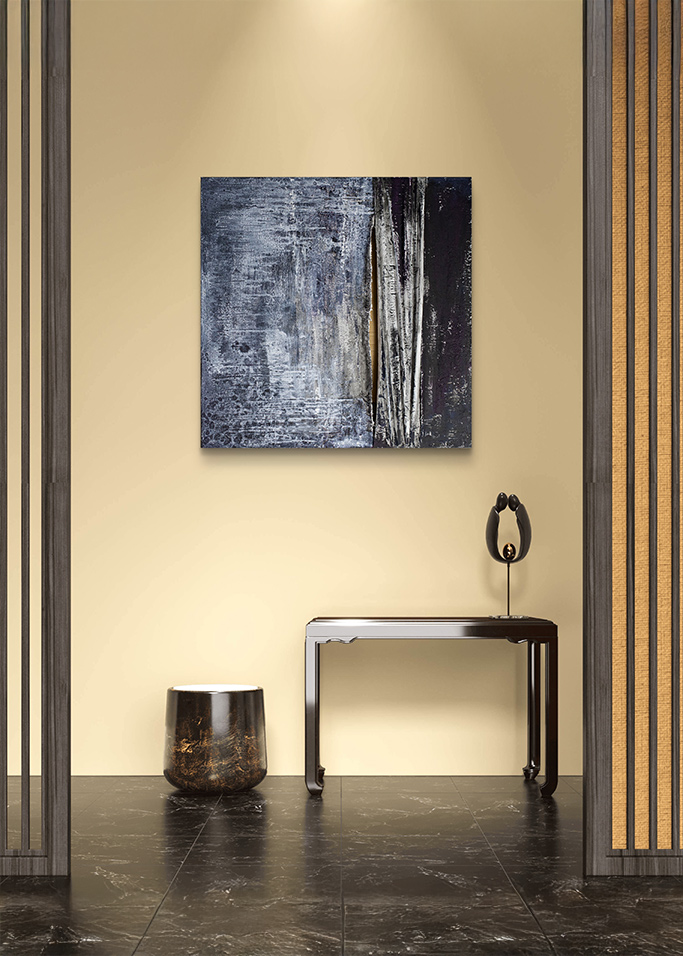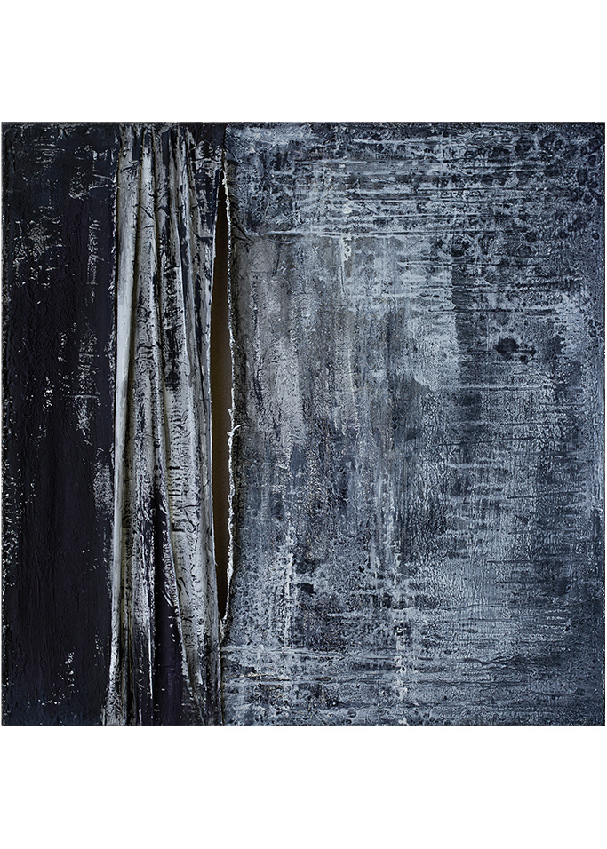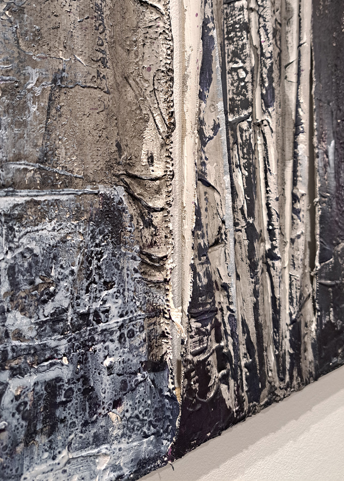 „Złudzenia 11” to obraz balansujący na granicy między strukturą a rozpadem, porządkiem a chaosem. Warstwowa kompozycja oparta na autorskiej technice tworzy przestrzeń pełną napięcia i nieoczywistości. Centralnym, znaczącym elementem pracy jest pęknięcie płótna — świadomy gest, który nie tylko burzy integralność powierzchni, ale staje się metaforą kruchości percepcji, przerwania ciągłości lub wewnętrznego pęknięcia. Obraz zaprasza do refleksji nad tym, co ukryte pod powierzchnią — i nad tym, jak łatwo to, co znane, może się rozpaść na nowe znaczenia.